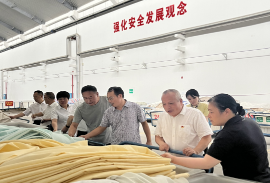 谢扶民一行还走访了雪松、纺科公司生产车间,查看了印染产品生产工艺流程及生产流水线情况。