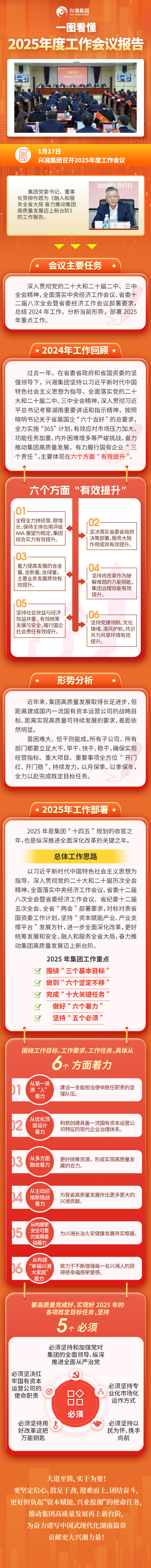 贺柳强调,要高质量完成好、实现好2025年各项既定目标任务,从第一资源“人”、优化顶层设计、多方面融合、主动迎接新挑战、构建更安全可靠的发展基础、构建“幸福m88asia大家庭”等六个方面着力;必须坚持和加强党对集团的全面领导、纵深推进全面从严治党,坚决扛牢国有资本运营公司的使命职责,坚持专业化市场化运作方式,坚持用好改革这把万能钥匙,坚持以民为怀、携手向前,更好担负起“资本赋能、兴业报湘”的使命任务,为奋力谱写中国式现代化湖南篇章贡献更大m88asia力量。